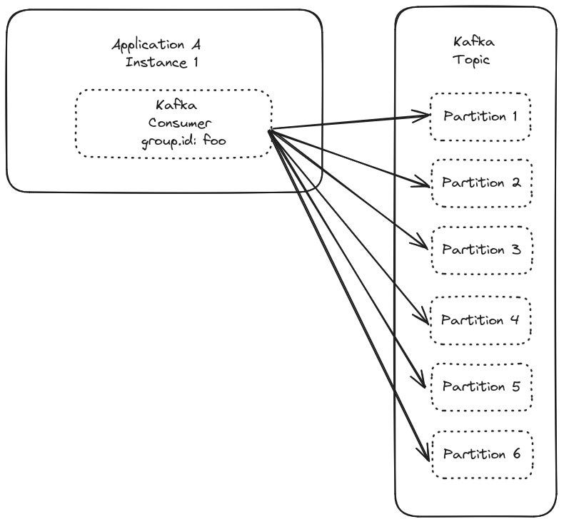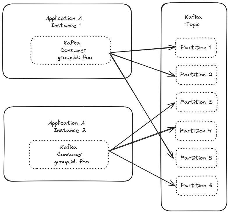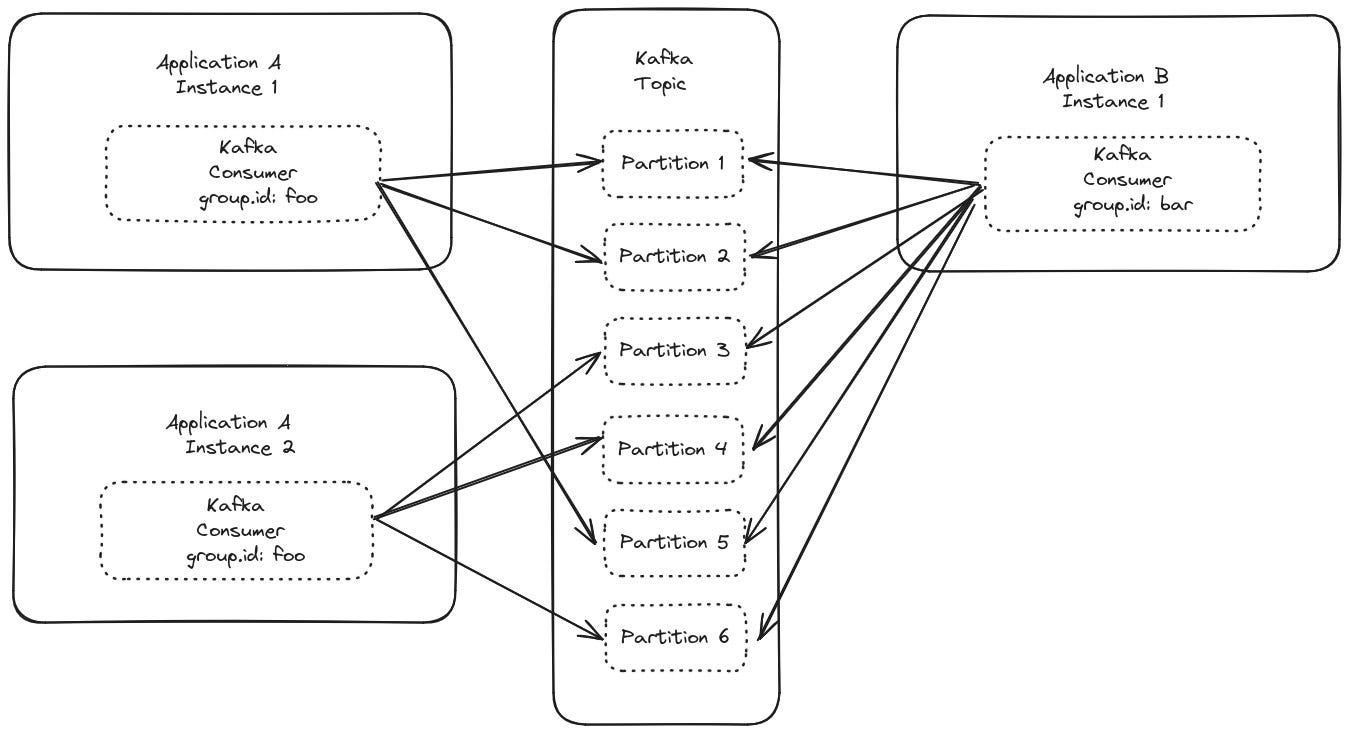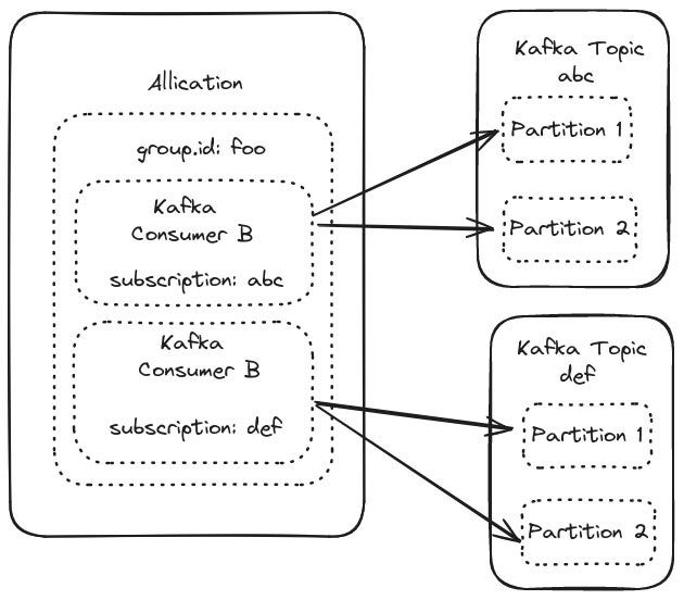 Nếu một dịch vụ có nhiều consumer đăng ký vào các topic khác nhau nhưng dùng chung một group.id, bất kỳ sự tái cân bằng nào do một consumer gây ra cũng sẽ ảnh hưởng đến các consumer khác trong group. Ví dụ, Consumer A đăng ký vào topic abc, trong khi Consumer B đăng ký vào topic def và cả hai đều thuộc cùng một consumer group foo. Nếu Consumer A mất quá nhiều thời gian để xử lý một lô dữ liệu và bị loại khỏi group, thì việc tái cân bằng sẽ xảy ra. Tất cả các phân bổ partition trong group, bao gồm cả những phân bổ của Consumer B, sẽ bị thu hồi và tái phân bổ lại.