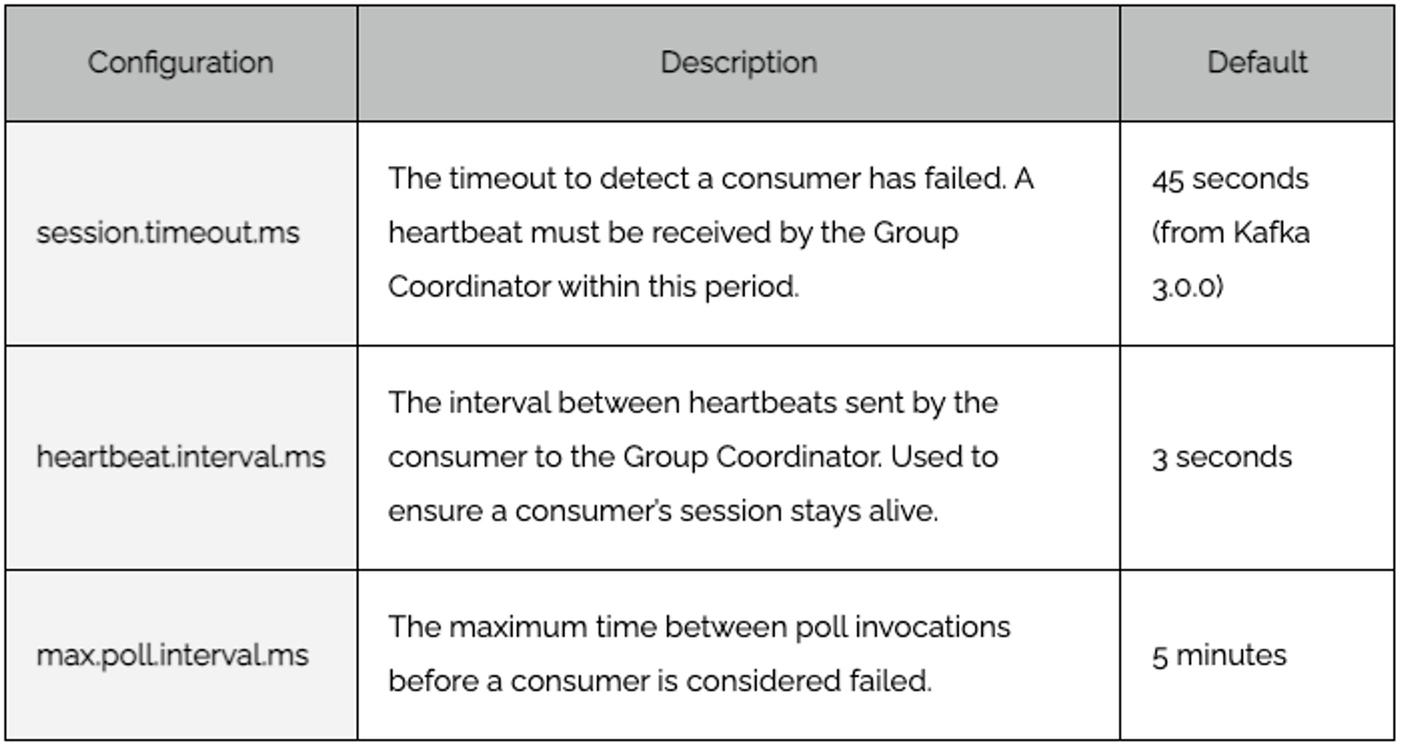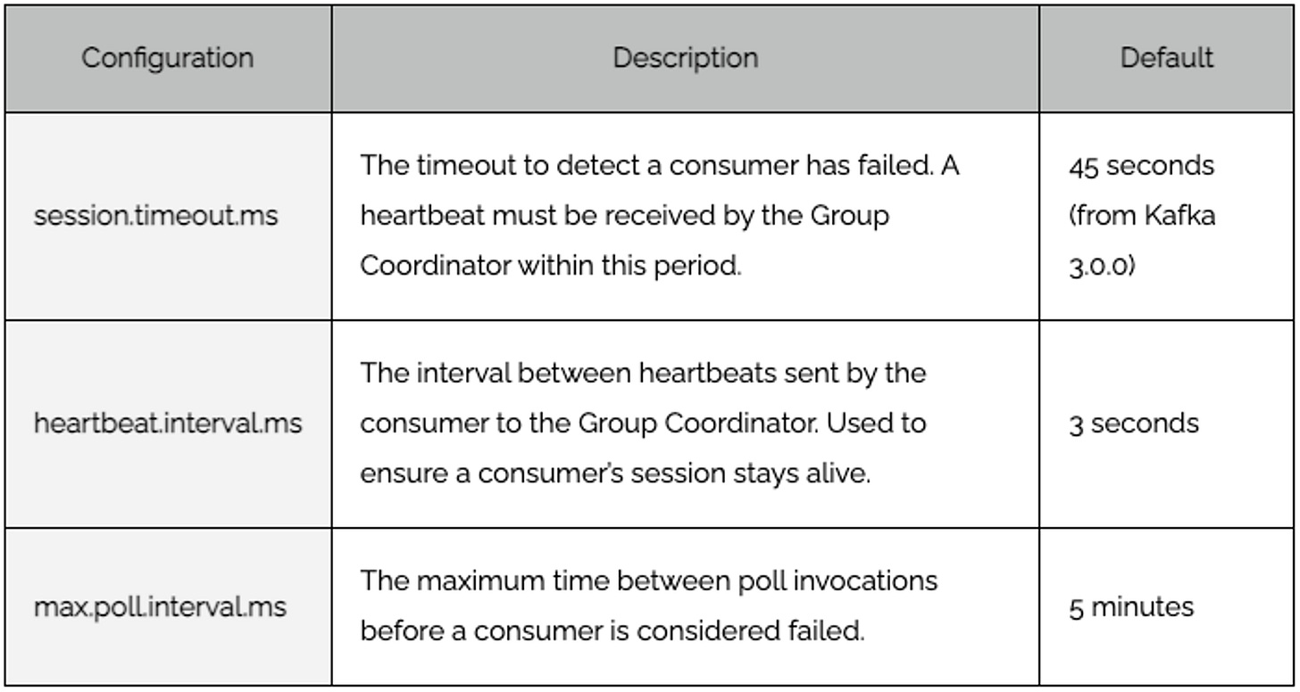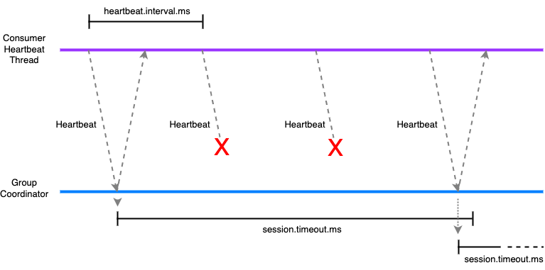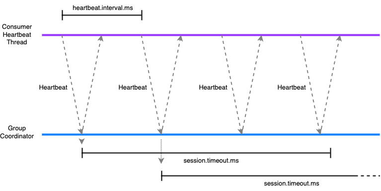 Trong consumer group các consumer gửi heartbeat định kỳ cho Group Coordinator. Điều này cho phép Group Coordinator theo dõi các consumer trong group. Mỗi heartbeat phải được nhận trong session.timeout.ms và heartbeat được gửi dựa trên heartneat.interval.ms