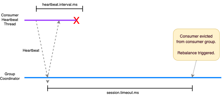 Nếu người tiêu dùng thất bại và không gửi heartbeats thì nó sẽ bị đuổi khỏi consumer group sau khi hết thời gian chờ phiên, dẫn đến việc tái cân bằng consumer group.