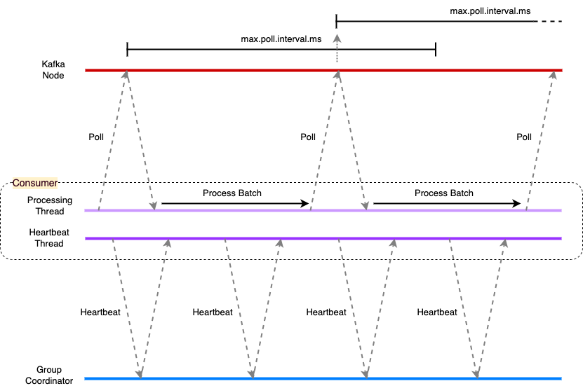 Heartbeats được thực hiện trên một luồng riêng biệt với luồng xử lý chính. Consumer poll các partition của topic trên luồng xử lý chính và mỗi lần gọi poll() phải diễn ra trong khoảng thời gian tối đa được cấu hình là max.poll.interval.ms. Sơ đồ dưới đây sẽ bổ sung luồng xử lý của consumer, thể hiện trách nhiệm của luồng này cùng với luồng heartbeat.