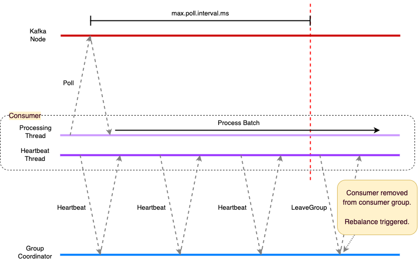 Lần đầu tiên gọi poll() và bất kỳ lần gọi poll() nào bao gồm các thay đổi như phân bổ lại partition, sẽ kích hoạt luồng heartbeat. Mỗi lần gọi poll() tiếp theo sẽ khởi động lại thời gian poll, đảm bảo rằng nó có toàn bộ khoảng thời gian max.poll.interval.ms để hoàn thành. Luồng heartbeat kiểm tra trạng thái của việc xử lý consumer, và nếu khoảng thời gian giữa các lần poll vượt quá max.poll.interval.ms, thay vì gửi một heartbeat, nó sẽ gửi yêu cầu LeaveGroup. Group Coordinator sau đó sẽ loại bỏ consumer khỏi consumer group và kích hoạt quá trình tái cân bằng.