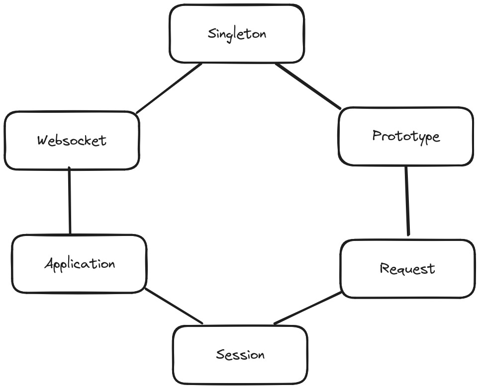 Trong Spring Framework, scope của một bean xác định phạm vi tồn tại của bean đó trong Spring Container. Nói cách khác, scope xác định thời điểm bean được tạo và có bao nhiêu instance của bean đó sẽ tồn tại trong suốt vòng đời của ứng dụng. Spring hỗ trợ nhiều loại scope khác nhau để tạo ra các instance cho các tình huống sử dụng khác nhau. Các scope cơ bản của Spring như hình bên dưới: