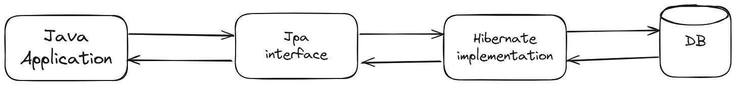 Tóm gọn lại chúng ta có thể hiểu như sau JPA là một tập hợp các interface định nghĩa các phương thức để thao tác với cơ sở dữ liệu. Các interface và phương thức này chỉ là quy định chung, không có logic cụ thể để thực hiện. Việc triển khai thực tế các phương thức đó được thực hiện bởi các framework như Hibernate, EclipseLink, hoặc OpenJPA. Trong đó, Hibernate là một trong những framework phổ biến nhất để triển khai JPA
